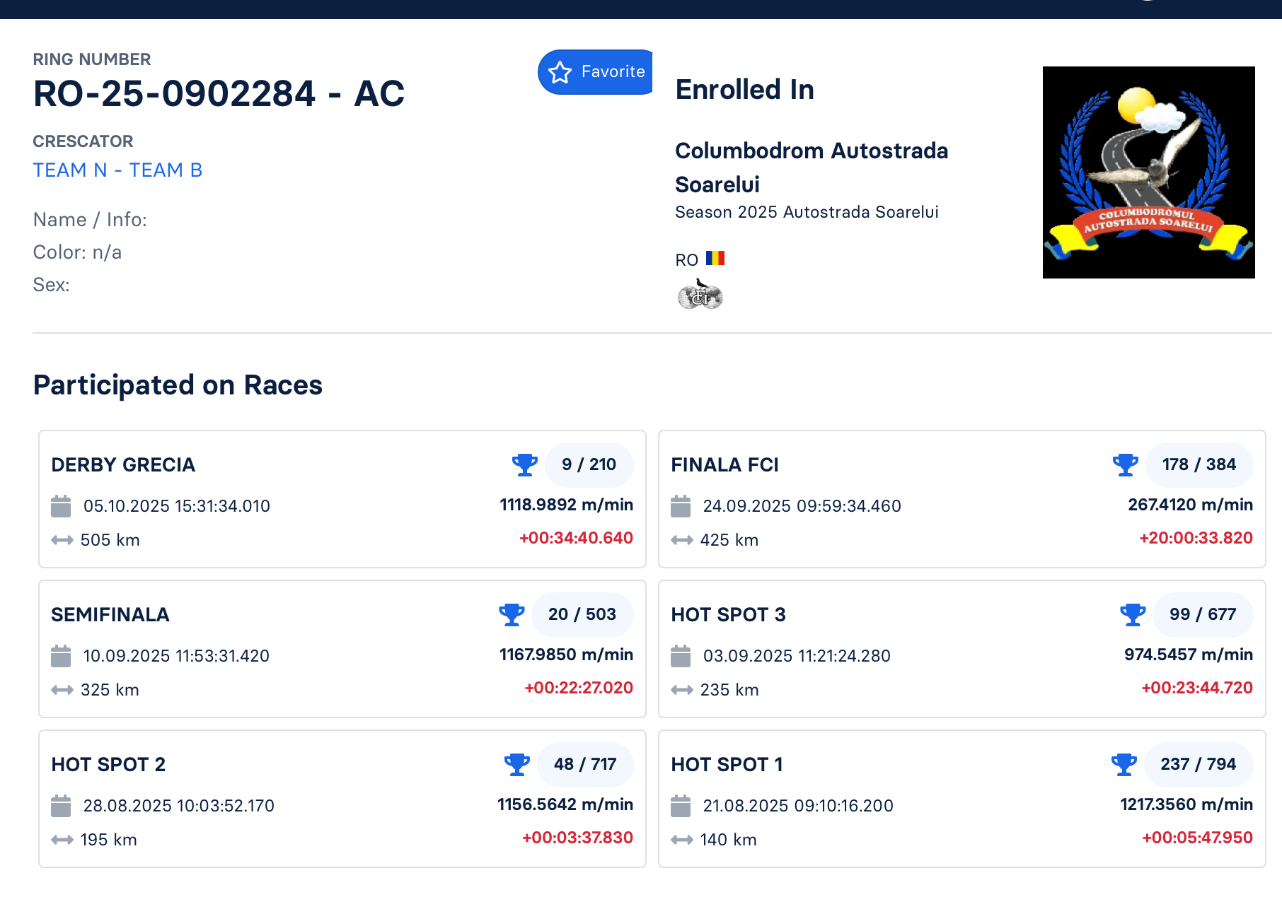 FATH TO *RO 21-291888* 2 PL DERBY 505 KM HORODNIC OLR, *RO 21-070754* 34 DERBY HORODNIC RACED BY PALOMA BLUE