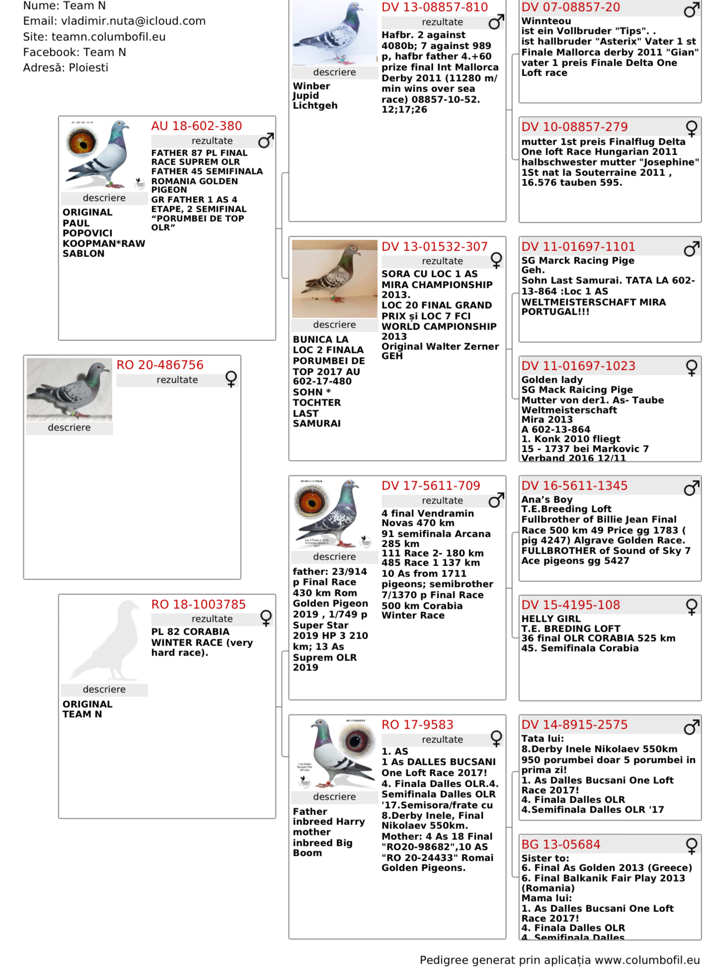 Father: 23/914 p Final Race 430 km Rom Golden Pigeon 2019 , 1/749 p Super Star 2019 HP 3 210 km; 13 As Suprem OLR 2019