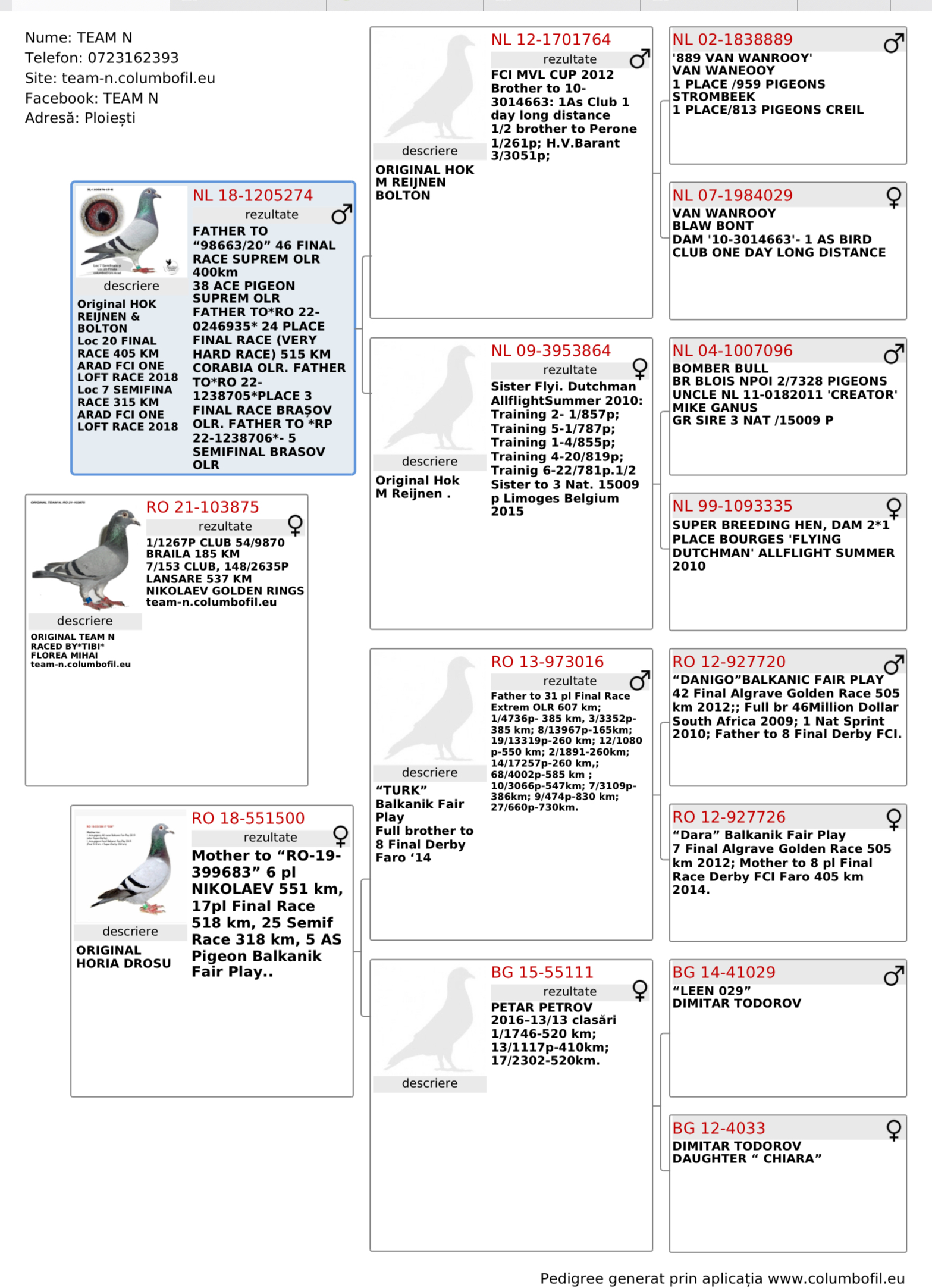 Mother to “RO-19-399683” 6 pl NIKOLAEV 551 km, 17pl Final Race 518 km, 25 Semif Race 318 km, 5 AS Pigeon Balkanik Fair Play..
