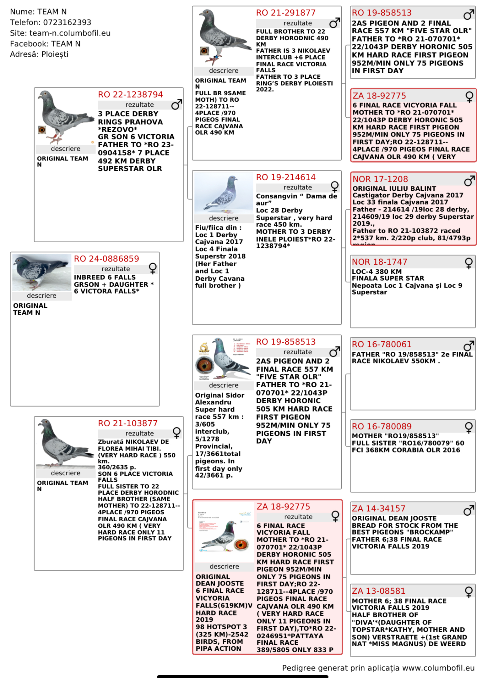 MOTHER TO *RO 21-070701* 22/1043P DERBY HORONIC 505 KM HARD RACE FIRST PIGEON 952M/MIN ONLY 75 PIGEONS IN FIRST DAY;RO 22-128711--4PLACE /970 PIGEOS FINAL RACE CAJVANA OLR 490 KM ( VERY HARD RACE ONLY 11 PIGEONS IN FIRST DAY),TO*RO 22-0246951*PATTAYA FINAL RACE
