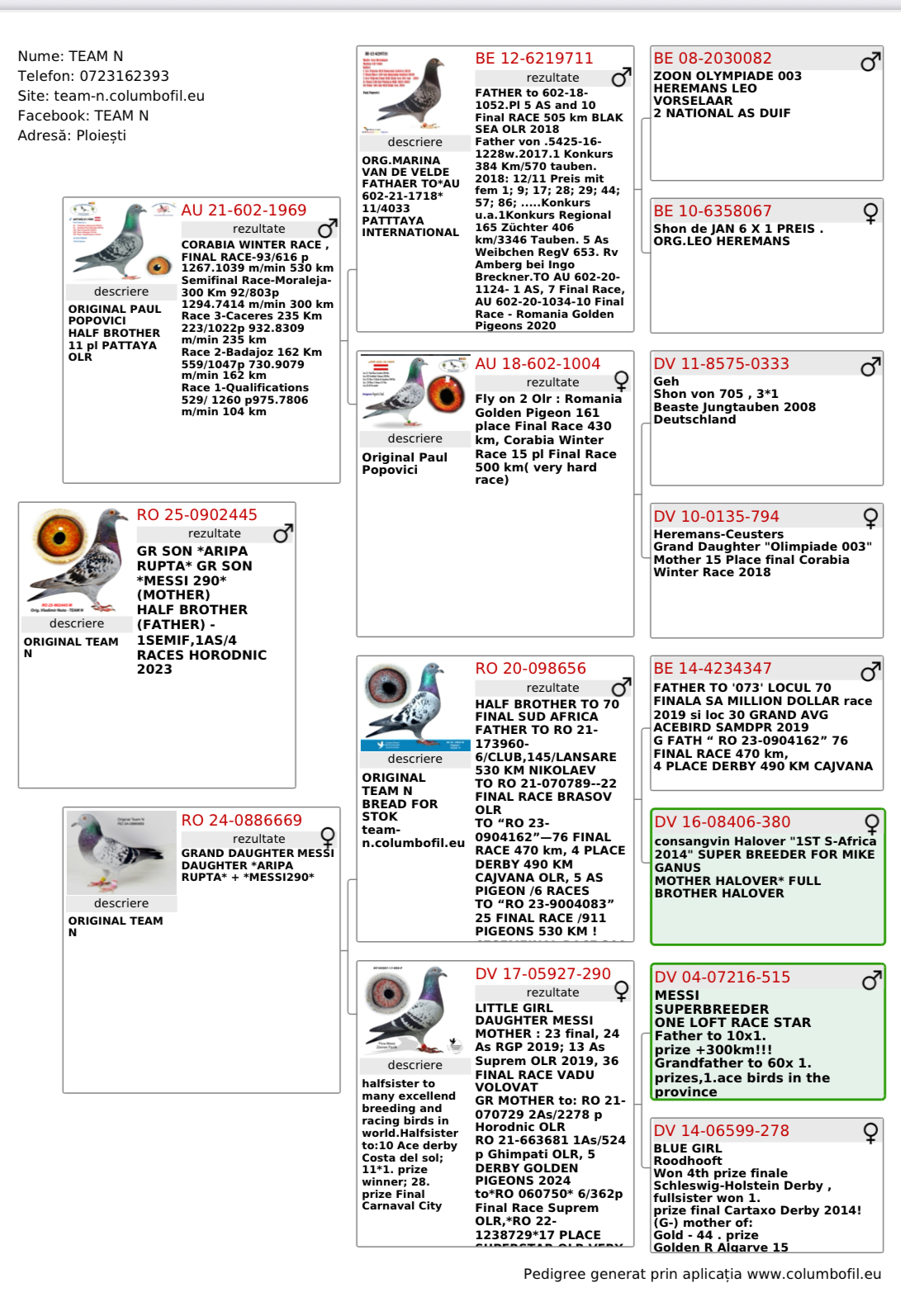 Father von .5425-16-1228w.2017.1 Konkurs 384 Km/570 tauben. 2018: 12/11 Preis mit fem 1; 9; 17; 28; 29; 44; 57; 86; .....Konkurs u.a.1Konkurs Regional 165 Züchter 406 km/3346 Tauben. 5 As Weibchen RegV 653. Rv Amberg bei Ingo Breckner.TO AU 602-20-1124- 1 AS, 7 Final Race, AU 602-20-1034-10 Final Race - Romania Golden Pigeons 2020
