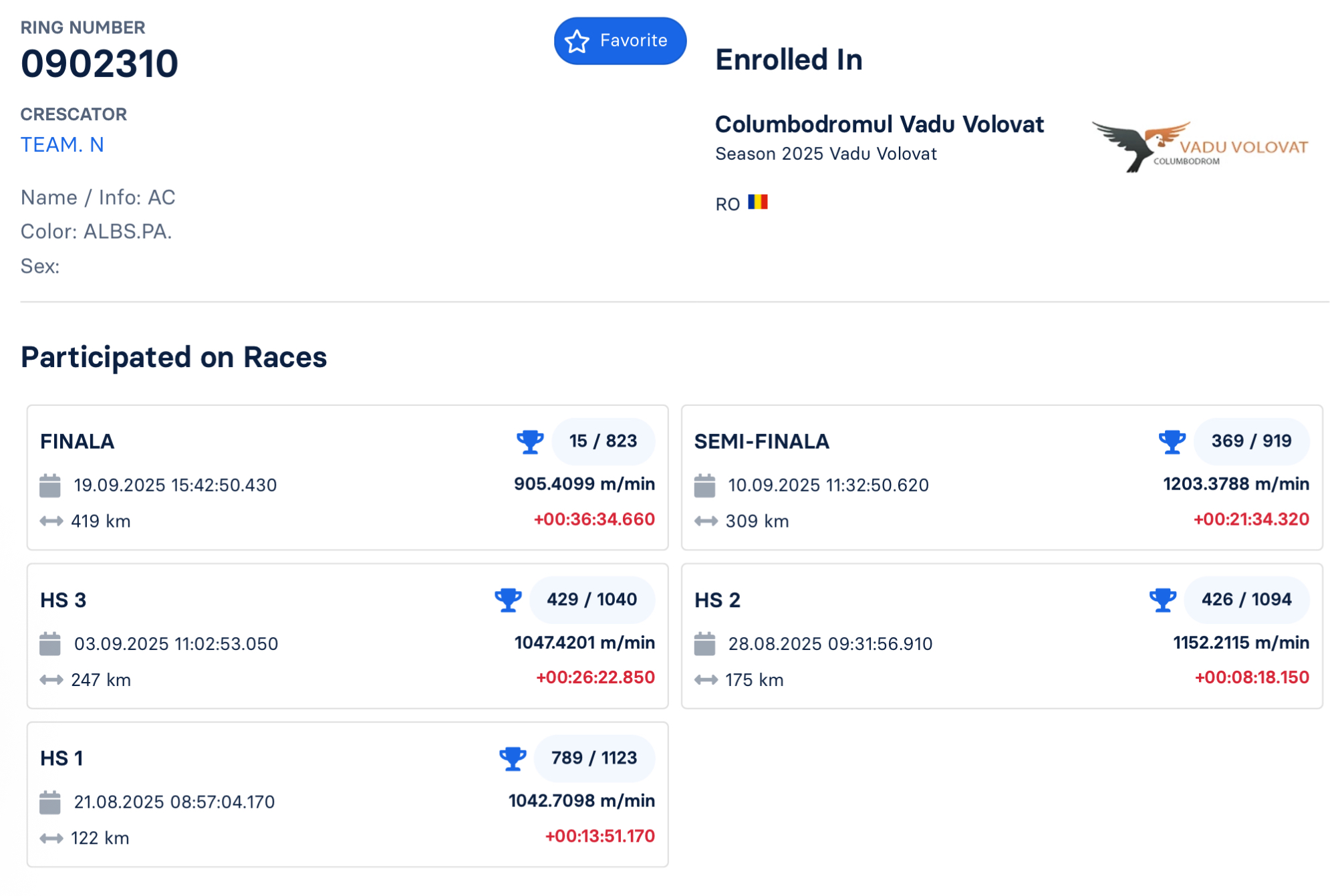 to*RO 060750* 6/362p Final Race Suprem OLR,*RO 22-1238729*17 PLACE SUPERSTAR OLR VERY HARD RACE 420 KM 13 AS PIGEON